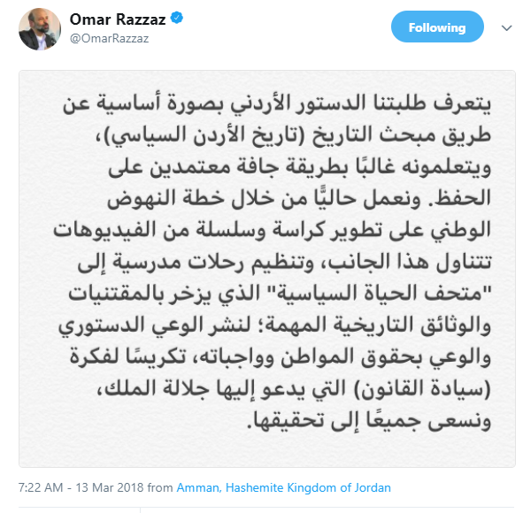 وكالة المرفا – قال وزير التربية والتعليم عمر الرزاز بأن الوزارة تعمل من خلال خطة التطوير الوطني على تفعيل معرفة طلاب المدارس بالدستور الاردني.  وقال الرزاز عبر حسابه في موقع التواصل الاجتماعي تويتر بأن معرفة الطلاب للدستور الاردني تتم من خلال مبحث التاريخ وتحديدا تاريخ الاردن السياسي، ويتم ذلك بطريقة جافة، لذلك تسعى الوزارة الى تطوير هذا الامر من خلال تطوير كراسة وعمل فيديوهات وكذلك رحلات الى مدرسية. ويأتي ذلك لتكريس فكرة سيادة القانون التي يدعو لها جلالة الملك عبدالله الثاني.