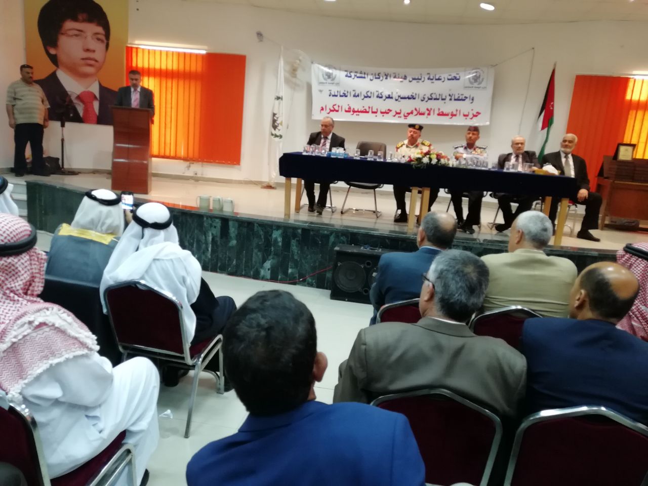 وكانت كلمة الختام للنائب الأسبق مدالله الطراونة أمين عام حزب الوسط الإسلامي الذي قال أن صرخة الجيش العربي الأردني انطلقت من أرض الأردن المباركة لتؤذن في الأمة كلها وبدماء الأبطال من الجيش العربي المصطفوي الأبي الذي التف حول قيادته الهاشمية المظفرة وسطر أجمل لوحة عرفها العرب في تاريخهم المعاصر محققا النصر. وأضاف أن أمامنا موعدا آخر مع كرامات قادمة مستعدون لها نعبد طريقها بالحرية والعدالة ونضيء دروبها بالوسطية والاعتدال والسماحة, وما أحوجنا وقد تمكن خفافيش الظلام من اختطاف ديننا وضرب وحدتنا وتدمير أحلامنا أن نستحضر مع الكرامة هذه الوسطية التي خرجت منها حضارتنا الإسلامية وشريعتنا السمحة إلى العالمين لتبني وتعيد للإنسانية القها.