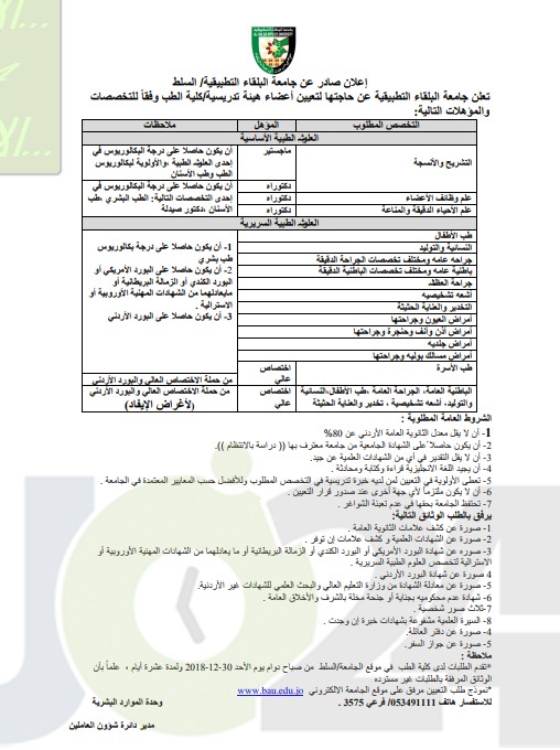 فتح باب استقبال طلبات التوظيف في البلقاء التطبيقية في كافة التخصصات – تفاصيل
