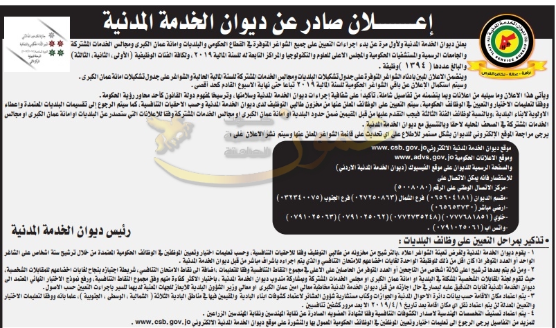 وبدأ ديوان الخدمة باعلان شواغر البلديات ومجالس الخدمات المشتركة وامانة عمان الكبرى على أن تعلن باقي الشواغر تباعاً حتى نهاية الأسبوع المقبل.