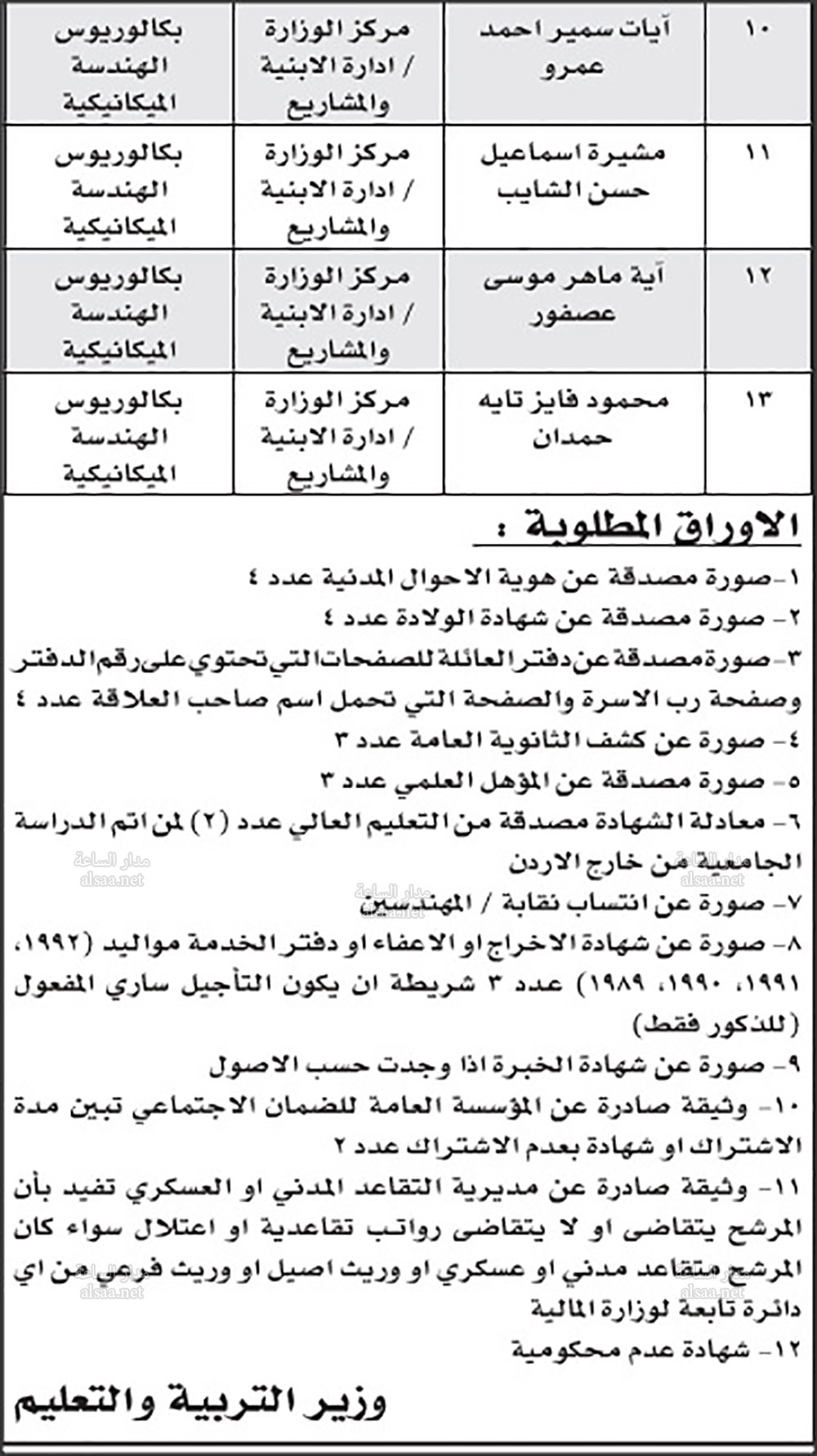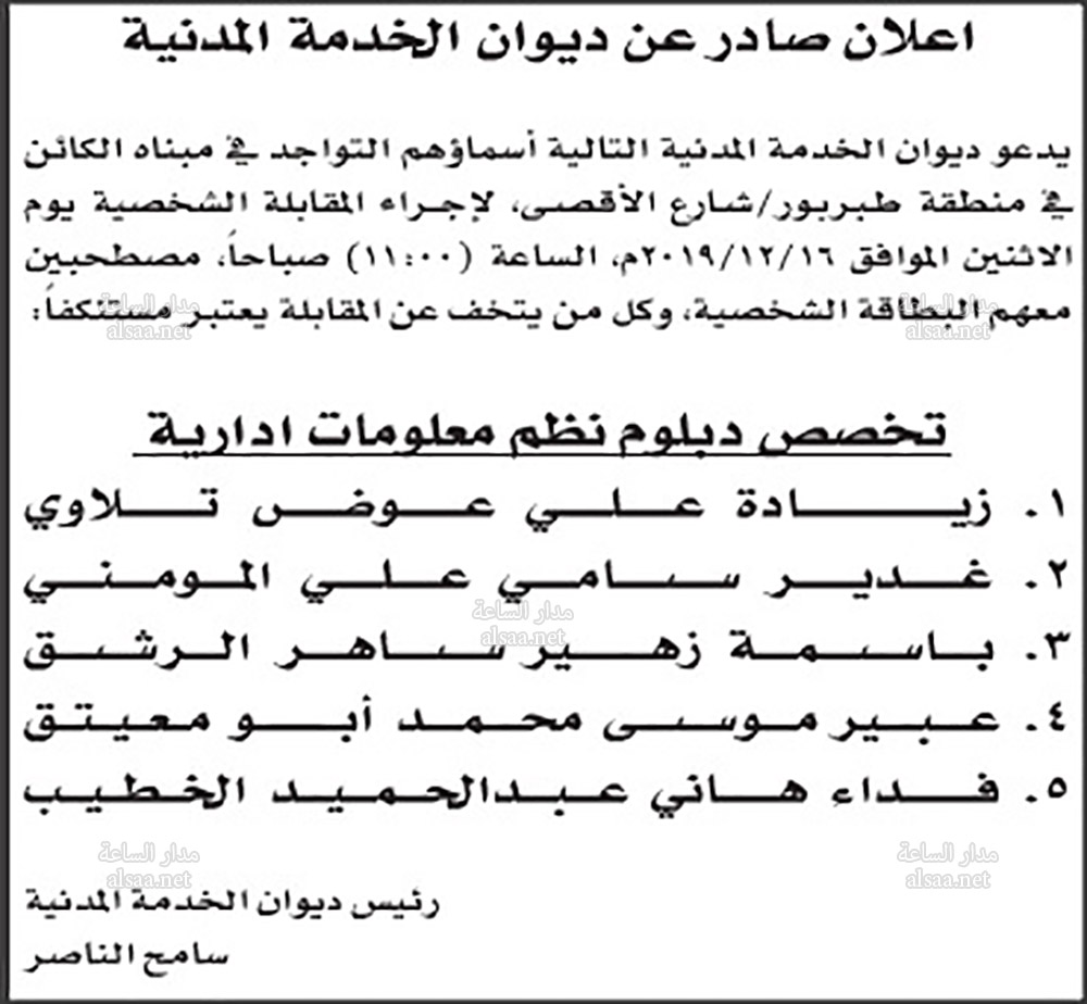 فيما دعا ديوان الخدمة المدنية التالية اسماؤهم الى مقابلات لغايات التعيين.