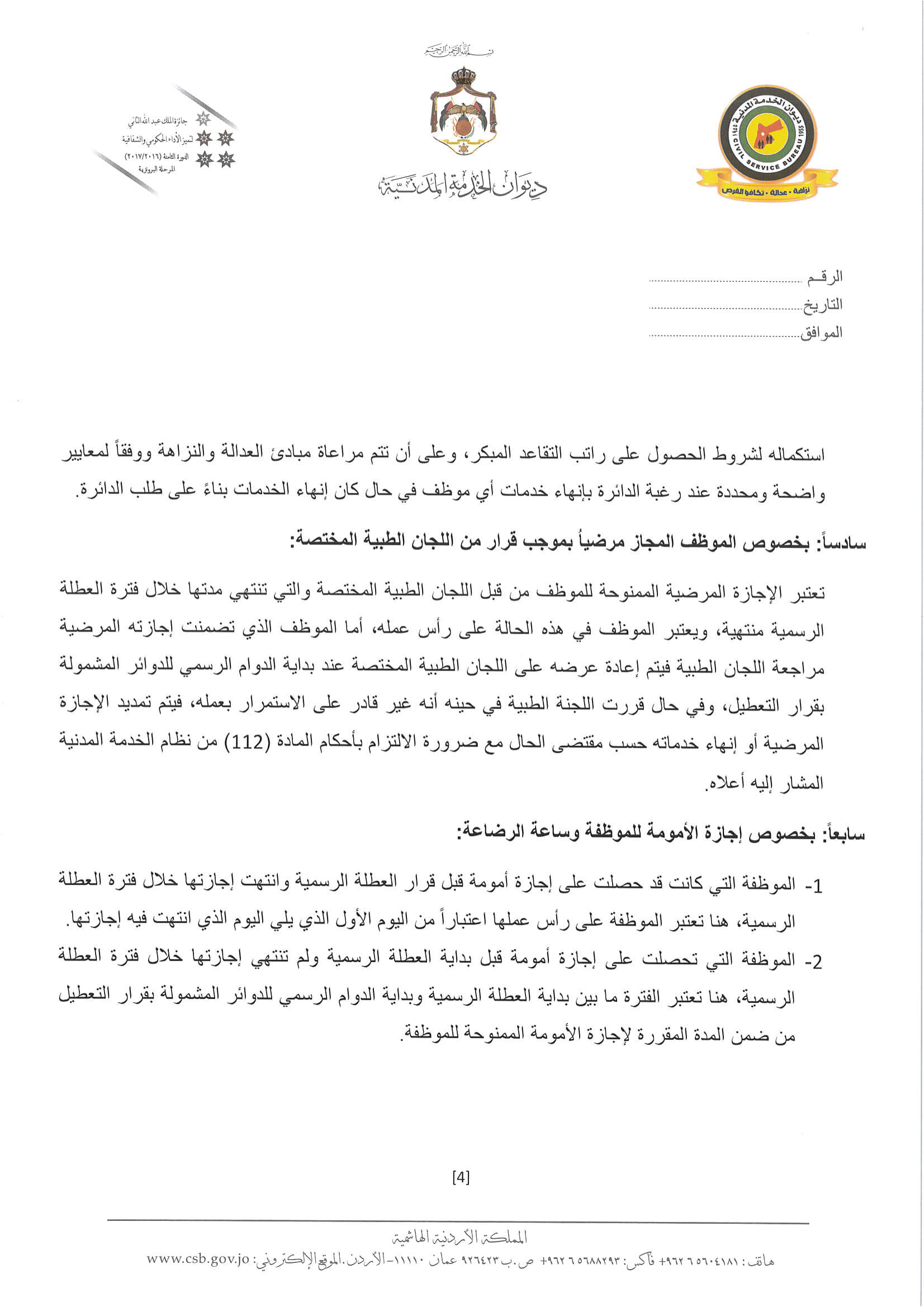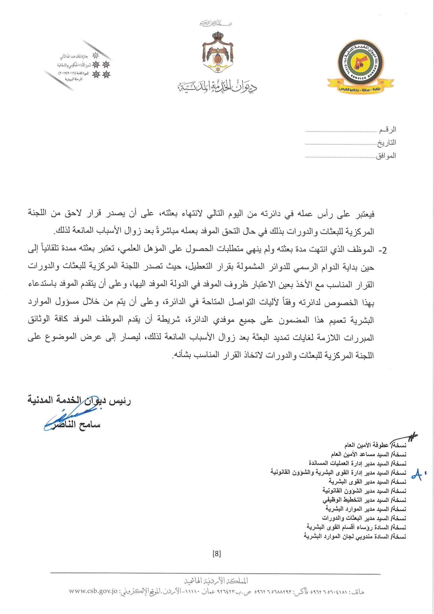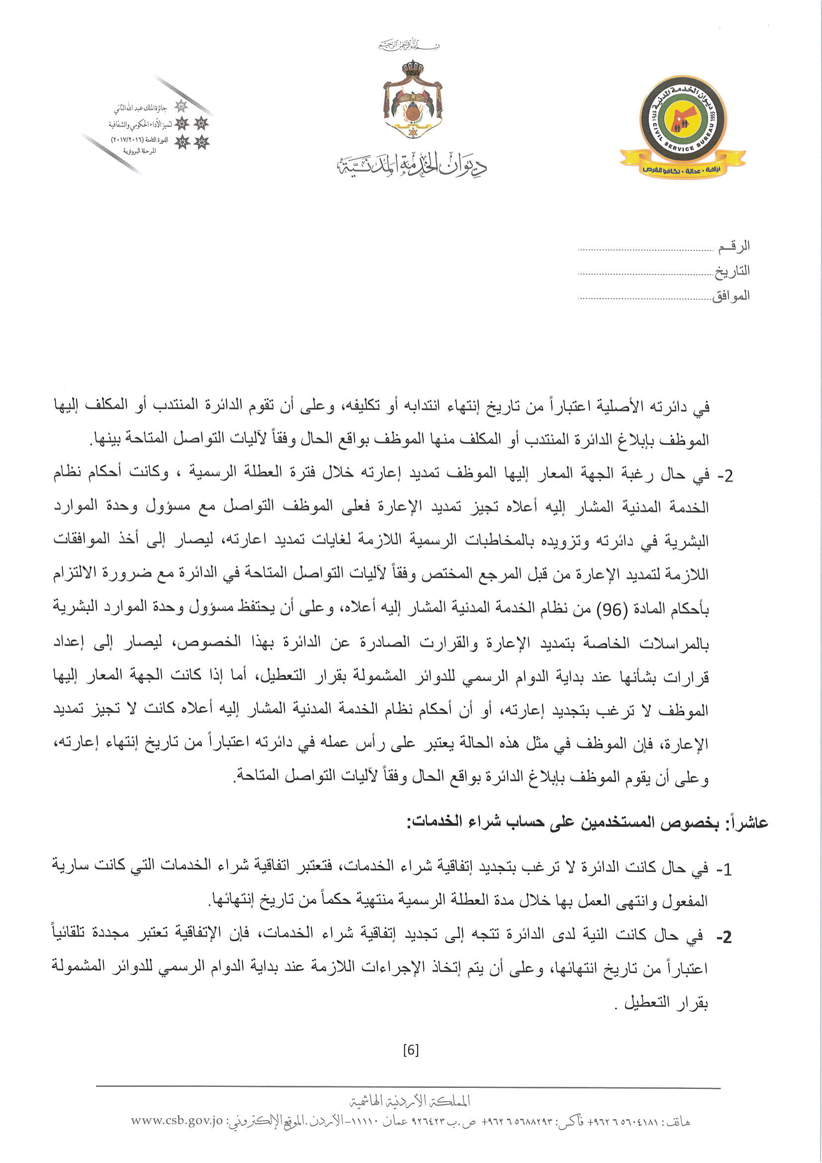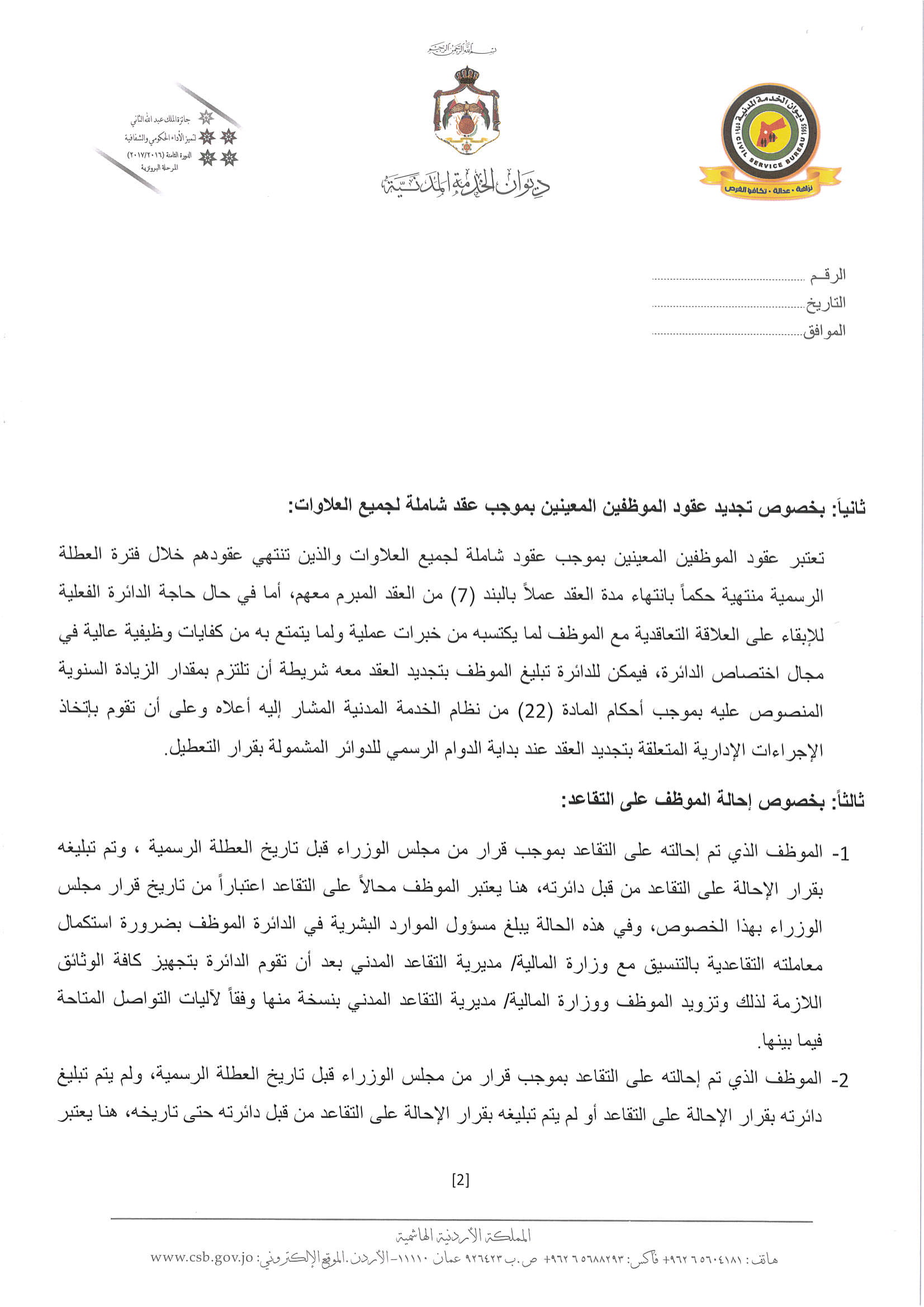 وقرر الديوان اعتبار عقود الموظفين المعينين بموجب عقود شاملة لجميع العلاوات والذين تنتهي عقودهم خلال فترة العطلة الرسمية منتهية حكما بانتهاء مدة العقد المبرم معهم، أما في حال حاجة الدائرة الفعلية للابقاء على الموظف لما يكتسبه من خبرات عملية ولما يتمتع به من كفايات وظيفية عالية في مجال اختصاص الدائرة، فيمكن تبليغ الموظف بتجديد العقد معه شريطة الالتزام بالزيادة السنوية المنصوص عليها بموجب أحكام المادة 22 من نظام الخدمة المدنية، على أن يتم اتخاذ الاجراءات الادارية المتعلقة بتجديد العقد عند بداية الدوام الرسمي للدوائر المشمولة بقرار التعطيل.