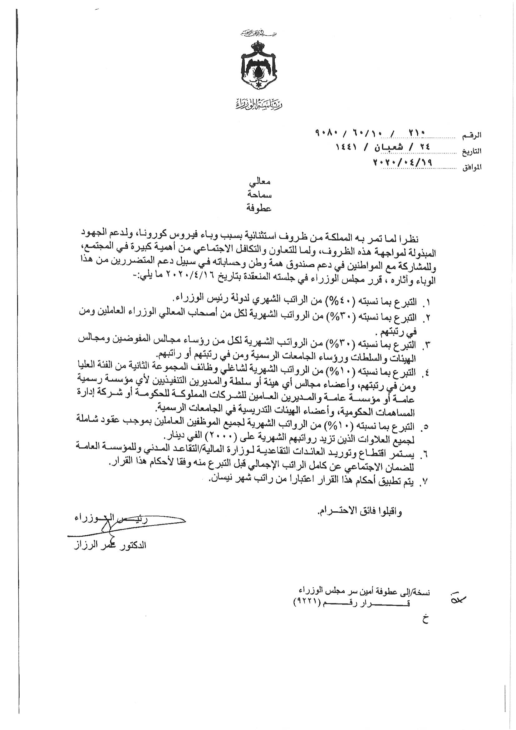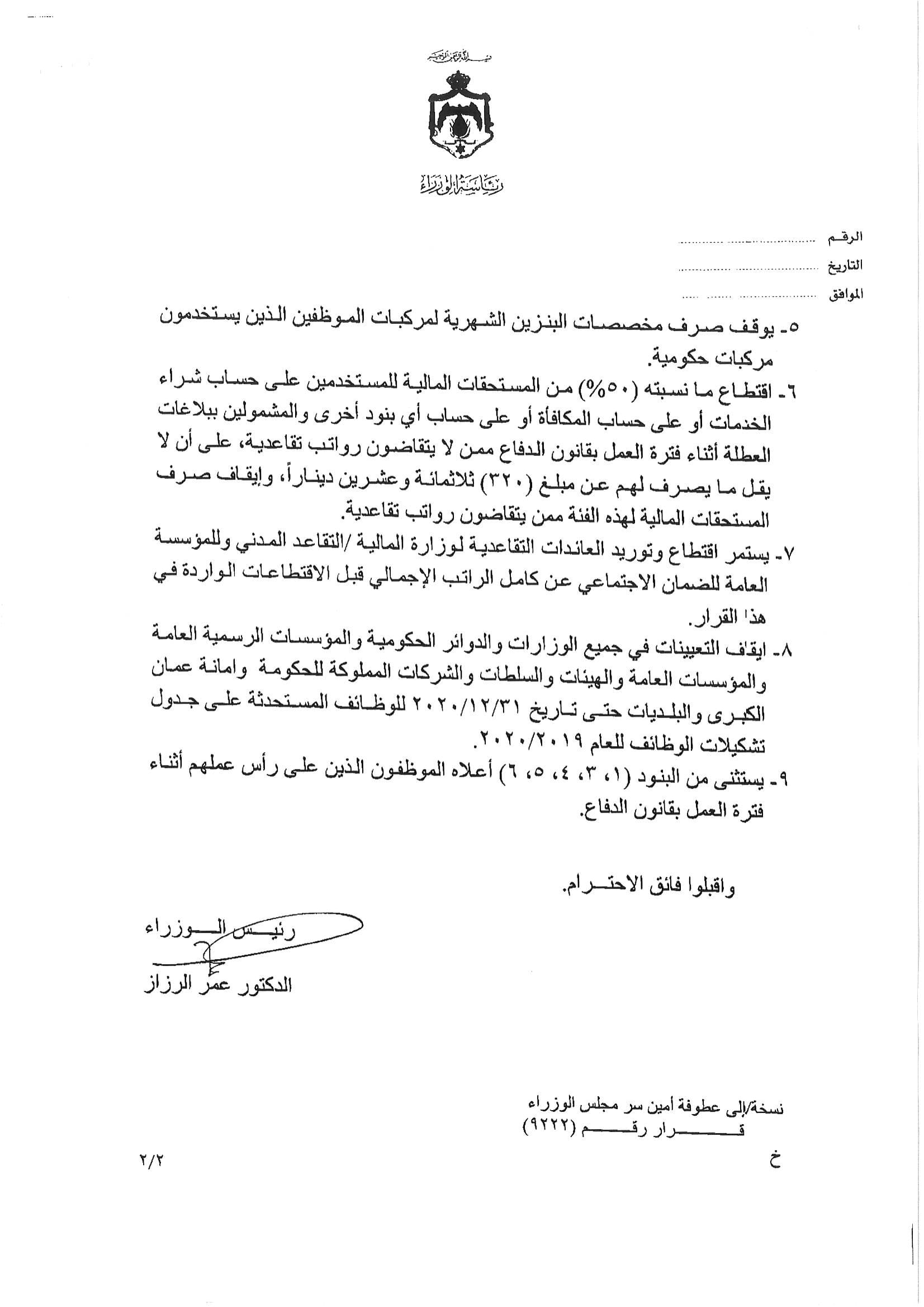 وقال إنه سيتم اعادة النظر بمضمون هذه العقود عند بداية الدوام الرسمي للدوائر المشمولة بقرار التعطيل ومدى رغبة طرفي العقد باستمرار العلاقة التعاقدية بينهما من عدمه، وعلى أن تراعي أحكام نظام الخدمة رقم 9 لسنة 2020 بهذا الخصوص.