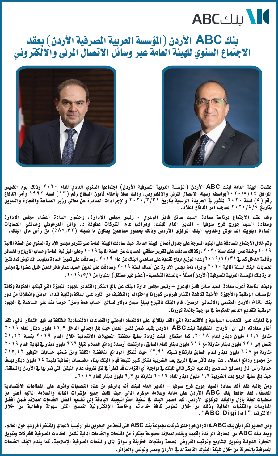 ا- عقد بنك ABC الأردن الاجتماع السنوي للهيئة العامة عبر وسائل الاتصال المرئي والالكتروني