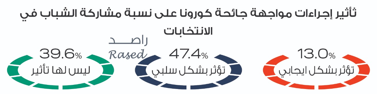 ويعتقد 47.4% من الشباب أن إجراءات مواجهة جائحة كورونا ستؤثر بشكل سلبي على نسبة مشاركة الشباب في الانتخابات ويعتقد 39.6 % ليس لها تأثير، في حين يرى 13% من الشباب أن التأثير سيكون إيجابي.