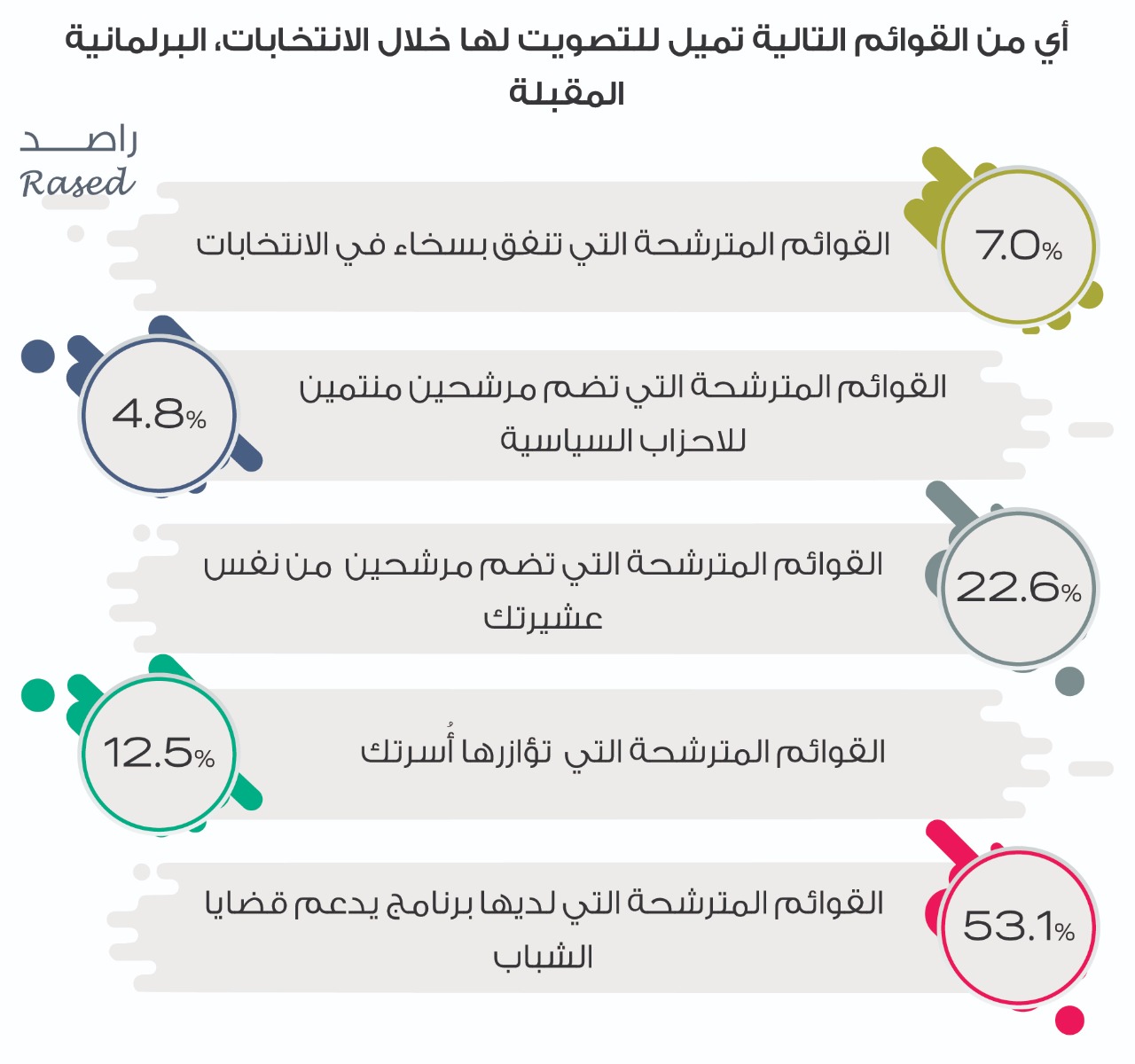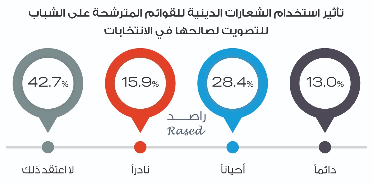 ويميل الشباب للتصويت للقوائم المترشحة التي لديها برامج تدعم قضايا الشباب بنسبة 53.1%، تلتها التصويت للقوائم التي تضم مرشحين من نفس عشيرة الشباب بنسبة 22.6% ثم القوائم التي تؤازرها الأسرة 12.5% ثم القوائم المترشحة التي تنفق بسخاء 7% والقوائم التي تضم مرشحين منتمين للأحزاب السياسية 4.8 %.