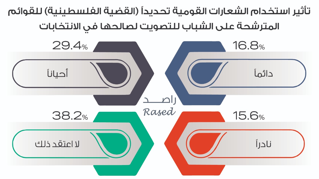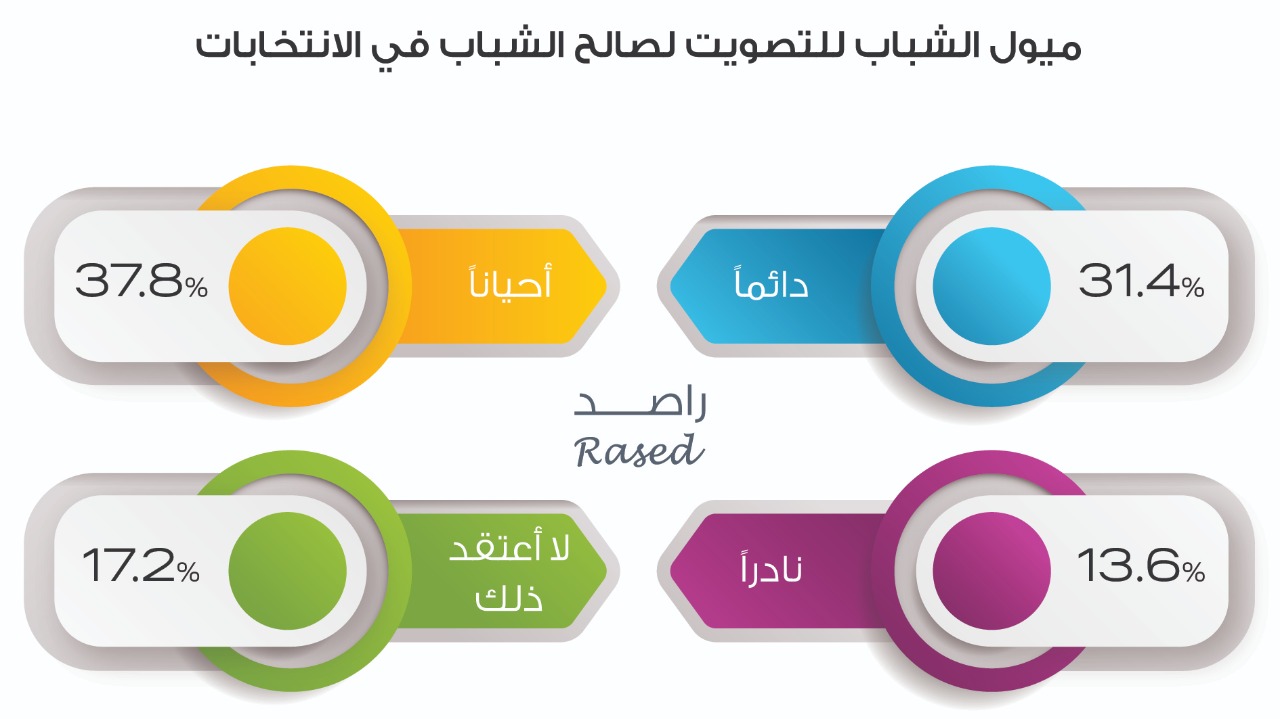 ويرى 37% من الشباب أن الشباب “أحيانا” يمتلكون وعياً سياسياً كافياً خلال المشاركة في الانتخابات، فيما يرى 29% أن الشباب يملكون “دائماً” هذا الوعي، ولا يعتقد 20.7% من الشباب أن الشباب يملكون وعياً سياسياً كافياً.