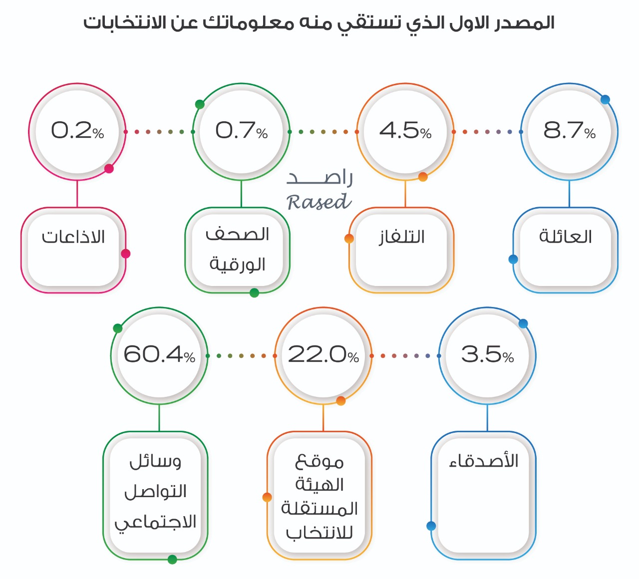 وجاءت وسائل التواصل الاجتماعي في المركز الأول من حيث أكثر المصادر التي يستقي منها الشباب معلوماتهم حول الانتخابات وبنسبة 60.4% وحل موقع الهيئة المستقلة للانتخاب في المركز الثاني وبنسبة 22.0% وحلت العائلة بالمركز الثالث بنسبة 8.7% وحل التلفاز في المركز الرابع بنسبة 4.5% وفي المركز الخامس حل الأصدقاء بنسبة 3.5% وفي المركز السادس حلت الصحف الورقية بنسبة 0.7% وفي المركز الأخير حلت الإذاعات بنسبة 0.2%.