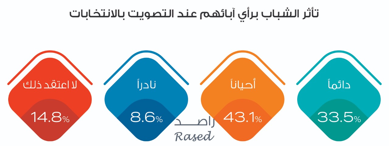 وفيما يتعلق بتأثر الآباء على سلوك الأبناء الشباب في سلوكهم التصويتي فقد تبين أن 33.5% يتأثرون، فيما يتأثر أحياناً 43.1%، فيما بلغت نسبة لا يتأثرون 14.8%، بينما بلغت نسبة الذين يتأثرون بشكل نادر 8.6%.