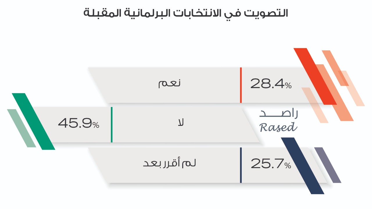 وبينت النتائج أن 45.9% من الشباب لا ينوون المشاركة في الانتخابات القادمة في حين بلغت نسبة ممن يرغبون بالمشاركة ولإدلاء بأصواتهم 28.4% وبلغت نسبة الذين لم يقرروا بعد المشاركة 25.7% من مجموع المستجيبين، مما يعني أن هذه النسبة ما زالت لم تحسم أمرها ويمكن العمل عليها واستهدافها للمشاركة الفاعلة في الانتخابات القادمة مما سيساهم في زيادة نسبة التصويت يوم الاقتراع.