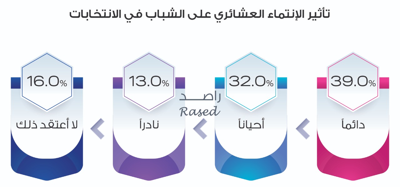وبحسب النتائج أيضاً وبما يتعلق بتأثير الانتماء العشائري، يرى 39% من الشباب أن الانتماء العشائري يؤثر عليهم سلباً في سلوكهم التصويتي، فيما قال 32% من الشباب أن الانتماء العشائري يؤثر عليهم أحياناً، بينما قال 13 % ان التأثير “نادرا” ما يقع في حين لا يعتقد 16% من أن الانتماء العشائري يؤثر على سلوكهم التصويتي.