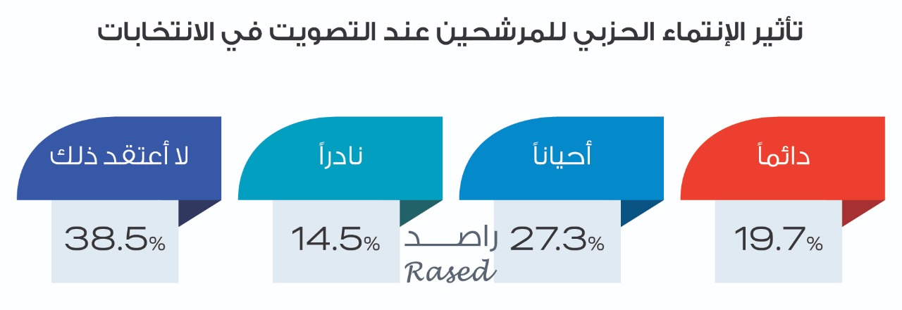 وقال 53.1% من الشباب أنهم لا يأخذون اعتباراً للانتماء الحزبي للمترشحين عند التصويت، بينما قال 19.7% من الشباب أنهم يأخذون اعتباراً للانتماء الحزبي للمترشحين عند التصويت، وبحسب النتائج فإن نسبة ميل الشباب للتصويت لصالح المترشحين الشباب “دائماً” بلغت 31.4% من مجموع الشابات والشباب المستجيبين للعينة، وبلغت نسبة من يصوتون “أحياناً” للشباب 37.8%، في حين بلغت نسبة الشباب الذين لا يصوتون للمترشحين الشباب 17.3% من مجموع المستجيبين، و13.6 % قالوا بأنهم نادراً ما يصوتوا للشباب المترشحين في الانتخابات.