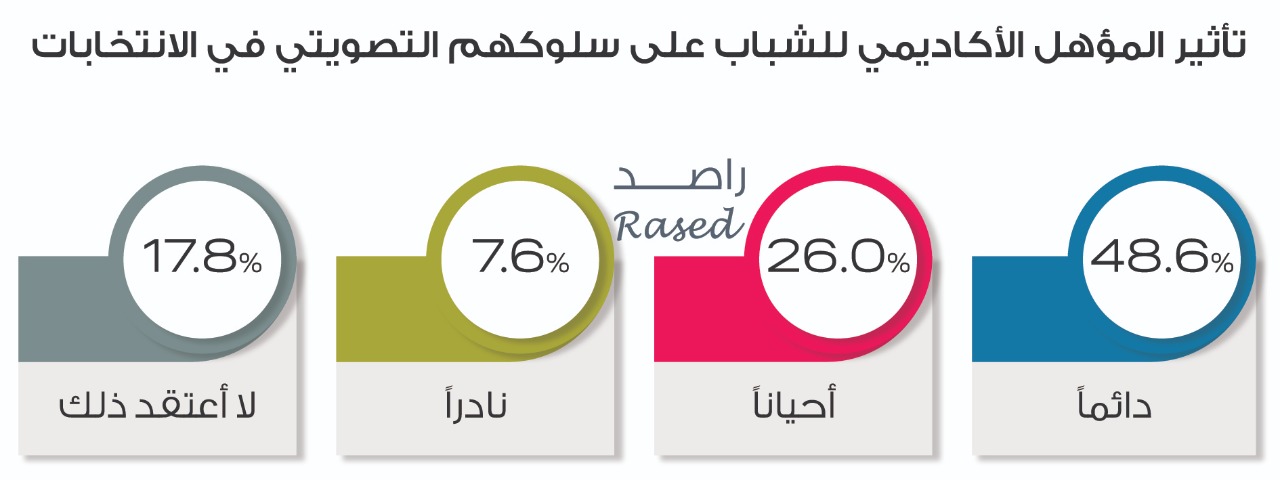 وقال 48.6% من الشباب أن المؤهل الأكاديمي يؤثر دائماً على سلوك الشباب التصويتي، فيما بلغت نسبة الشباب الذين يؤثر مؤهلهم الأكاديمي “أحياناً “على سلوكهم التصويتي 26%، بينما وصلت نسبة الذين لا يعتقدون أن مؤهلهم يؤثر على سلوكهم التصويتي إلى 17.8%، وقال 7.6% من الشباب أن مؤهل الأكاديمي “نادراً “ما يؤثر على السلوك التصويتي للشباب.