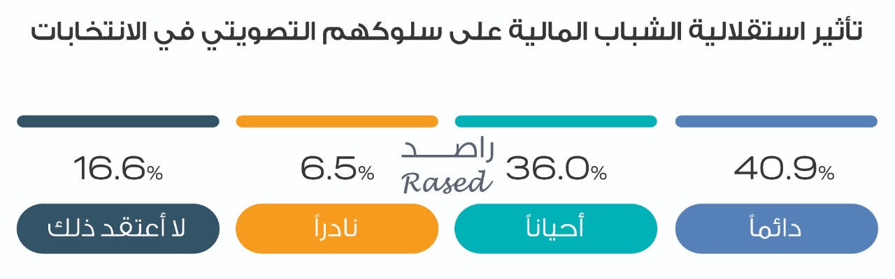وحول تأثير الاستقلال المالي للشباب في سلوكهم التصويتي، تبين أن 40.9% يتأثرون “دائماً” بذلك، فيما قال 36%من الشباب يتأثرون “أحياناً”، بينما وصلت نسبة الشباب الذين لا يعتقدون أن للاستقلال المالي أثراً على السلوك التصويتي 16.6% من المستجيبات والمستجيبين، وقال 6.5% أنهم “نادراً” ما يؤثر الاستقلال المالي على السلوك التصويتي.
