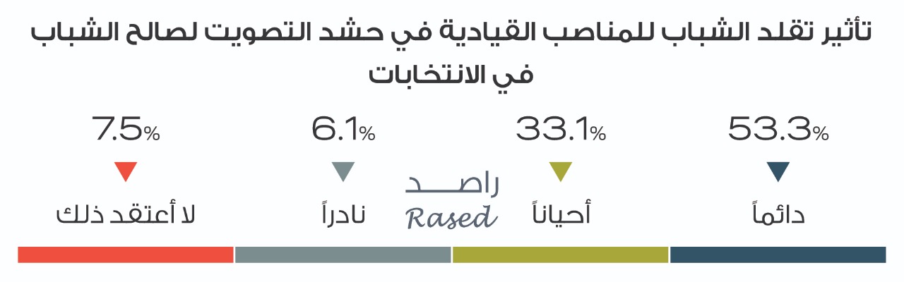 ويعتقد 53.2% من الشباب أن تقلد الشباب للمناصب القيادية له أثر إيجابي في حشد التصويت لصالح المترشحين الشباب للانتخابات، ويتأثر 33.1% “أحياناً”، فيما لا يعتقد 7.5% وجوداً لهذا التأثير، بينما يرى 6.1% أن وجود شباب في مناصب قيادية نادر ما يؤثر على سلوكهم التصويتي.
