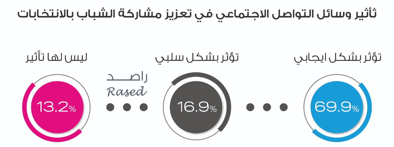 ويرى 70% من الشباب أن وسائل التواصل الاجتماعي تؤثر بشكل إيجابي في تعزيز مشاركتهم في الانتخابات، في حين يرى 16.9% أن تأثير بشكل سلبي ويرى 13.2% أن ليس لها تأثير.
