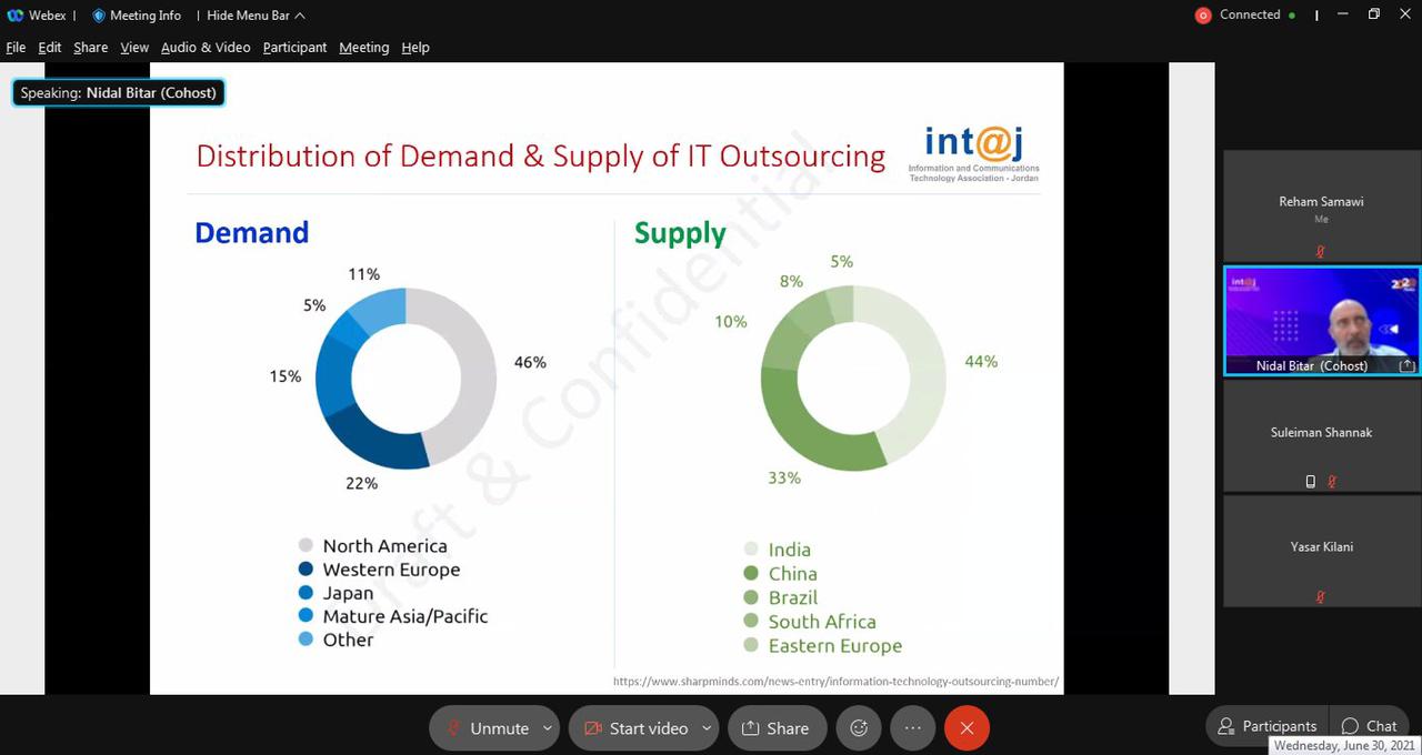 ودار نقاش موسّع خلال الاجتماع حول أهمية التعهيد والإسناد للخارج (IT Outsourcing) بالنسبة للشركات في الأردن، حيث اكد المجتمعون على ان الشركات لديها نماذج كثيرة لتطبيق الـ (IT Outsourcing)، لاسيما مع المنافسة الكبيرة مع دول المنطقة والعالم، داعين الى وجود برامج متخصصة لتدريب الخريجين وتهيئتهم للعمل ضمن بيئة التعهيد والإسناد للخارج في هذا المجال.
