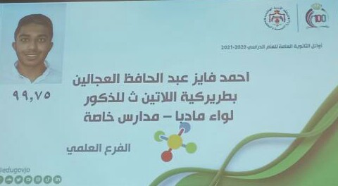المرفأ….أعرب طالب التوجيهي أحمد العجالين الأول على المملكة في الفرع العلمي، عن سعادته بحصوله على معدل 99.75.