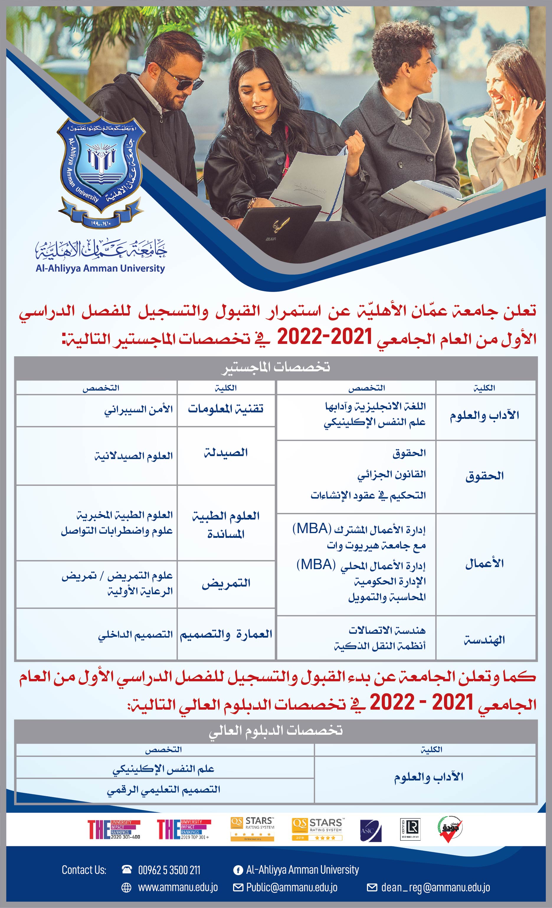 المرفأ……تعلن جامعة عمان الأهلية عن استمرار القبول والتسجيل للفصل الدراسي الأول من العام الجامعي 2021-2022 في تخصصات درجة الماجستيروالدبلوم العالي المذكورة في الاعلان المرفق .