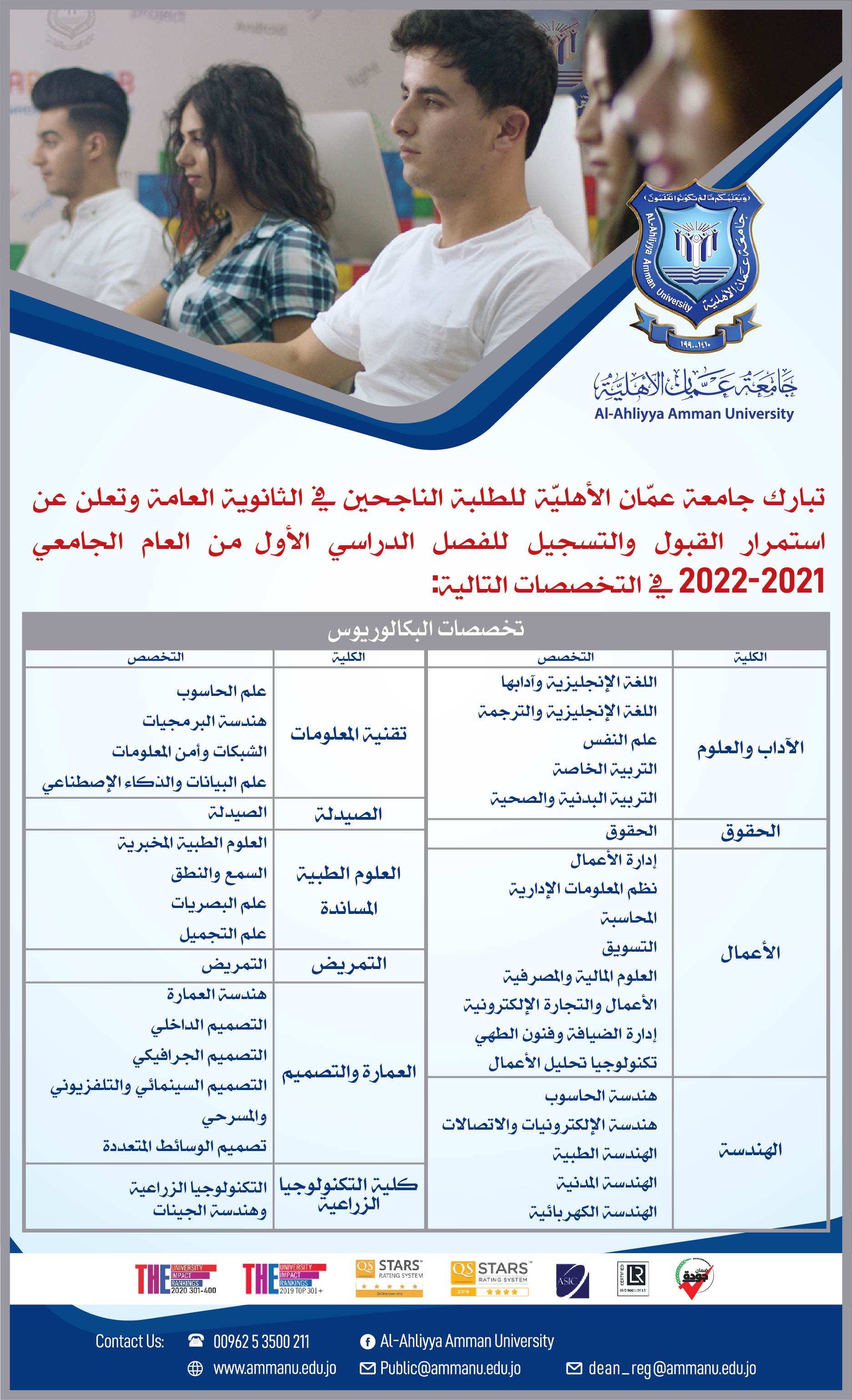 المرفأ…..تبارك جامعة عمان الأهلية للطلبة الناجحين في الثانوية العامة وتعلن عن استمرار القبول والتسجيل للفصل الدراسي الأول من العام الجامعي 2021-2022 في تخصصات درجة البكالوريوس المذكورة في الاعلان المرفق