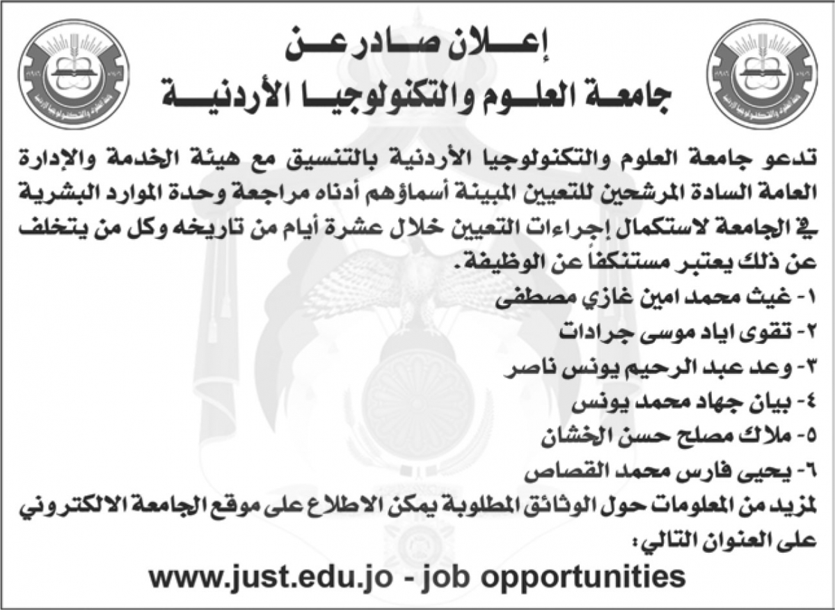 دعت هيئة الخدمة والادارة العامة بالتعاون مع وزارات ومؤسسات الحكومية، التالية اسماؤهم لاجراء المقابلات الشخصية لغايات استكمال اجراءات التعيين.