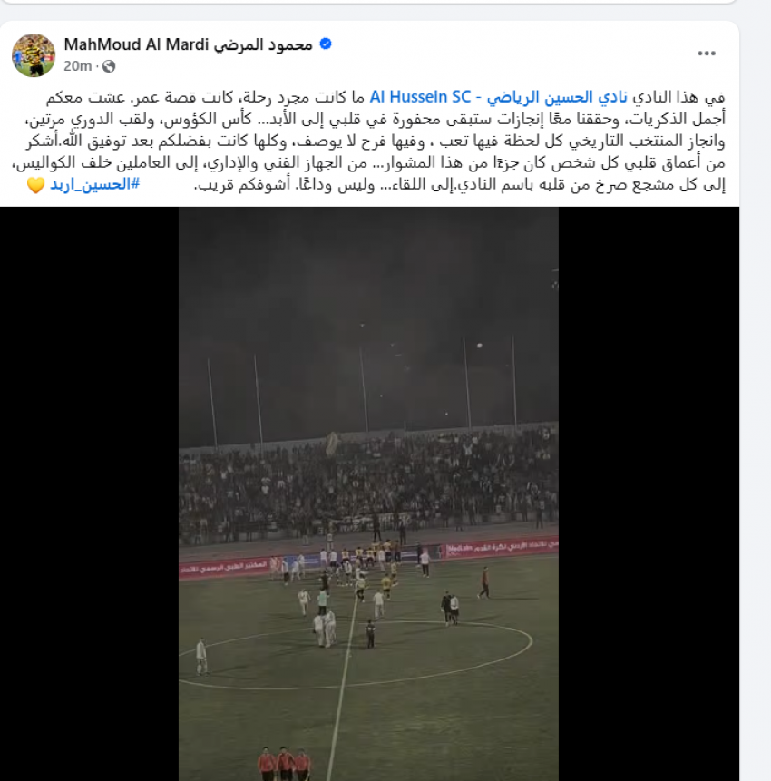 المرفأ… خاطب نجم المنتخب الوطني محمود المرضي جماهير ناديه الحسين، مودعًا إياهم بعد انتهاء مسيرته مع بطل دوري المحترفين.