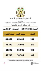 المرفأ….شهدت أسعار الذهب في السوق المحلي الأردني السبت ارتفاعا ملحوظا ، وذلك وفق التسعيرة الصادرة عن النقابة العامة لأصحاب محلات تجارة وصياغة الحلي والمجوهرات، حيث سجل عيار 21 الأكثر طلبًا بين الأردنيين انخفاضًا مقارنة بالأيام الماضية.