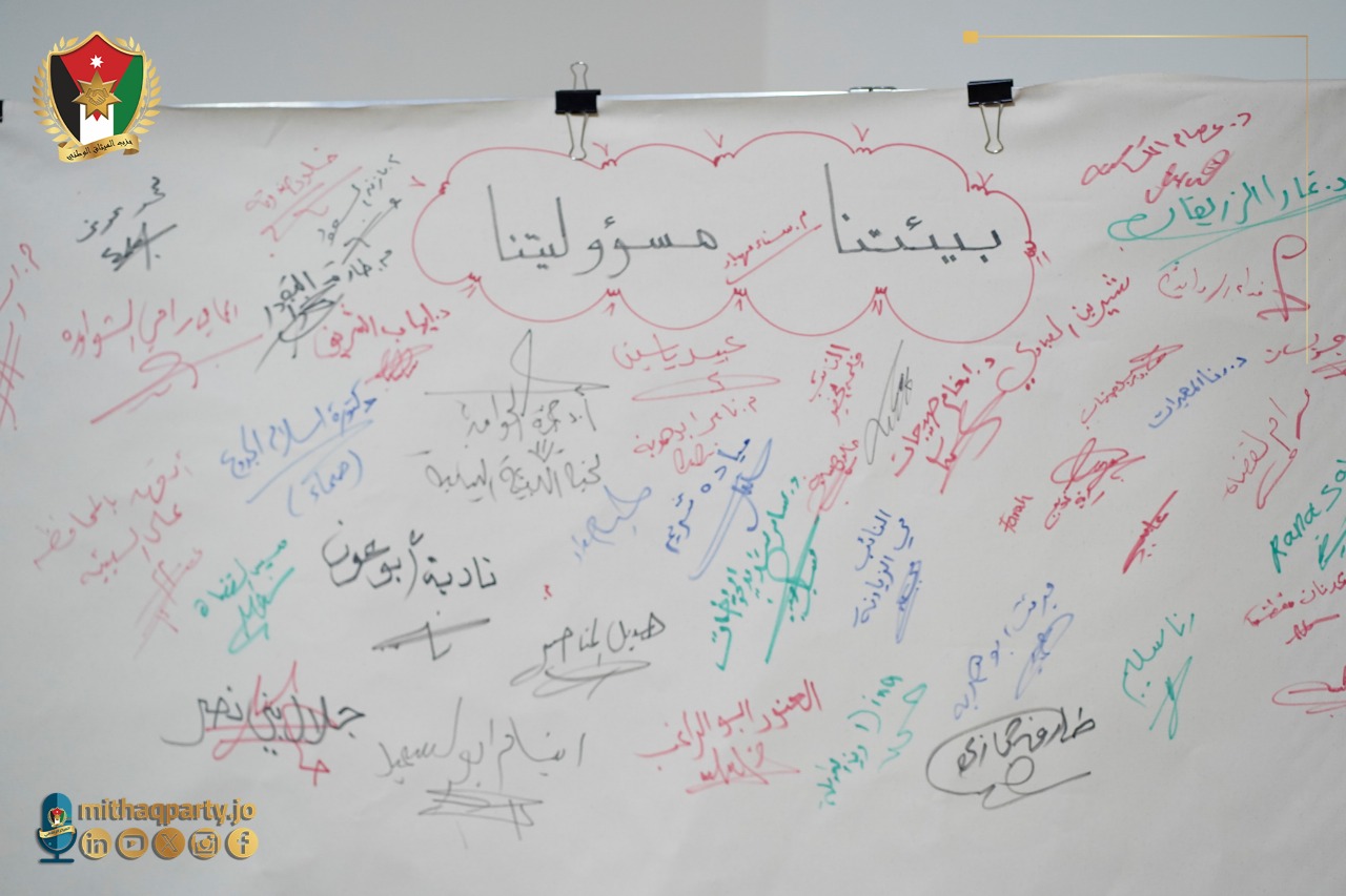 وفي ختام الفعالية تم التوقيع على جدارية اعتُبرت وثيقة شرف، تعبيراً عن إيمان الحزب العميق بأهمية المحافظة على البيئة الأردنية،ض والتزام جميع أعضائه بالبدء بأنفسهم لتجسيد هذا الميثاق البيئي في الممارسة اليومية والعمل الوطني.