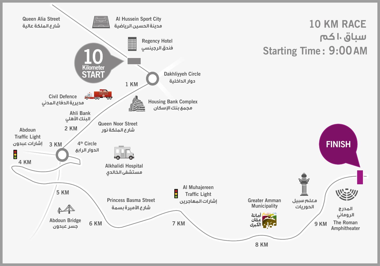 وتشمل الإغلاقات كذلك شارع عقبة بن نافع وشارع الأميرة بسمة بشكل كامل وحتى منطقة الساحة الهاشمية، وذلك من الساعة السادسة صباحاً وحتى الساعة الثانية عشرة ظهراً، ضمن مسار سباق الـ10 كم الذي ينطلق في الساعة التاسعة صباحاً.