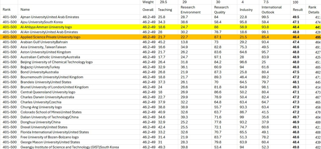 المرفأ…منعاً للتشويش والتضارب بنشرالأخبار حول نتائج تصنيف التايمز 2026 محلياً، تؤكد جامعة عمان الأهلية فوزها بالمركز الأول محليا ً، حيث جاءت في المرتبة 441 وبفارق 54 مرتبة عمن حل في المركز الثاني محلياً ضمن الفئة 401 – 500 عالمياً وفق الجدول المرفق الذي يوضح مجموع النقاط والمرتبة لكل جامعة ” بالتفصيل “.