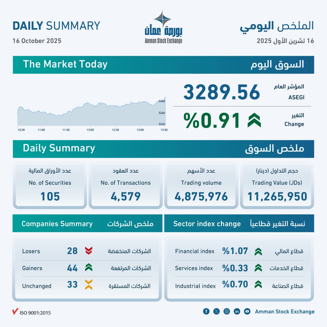 المرفأ…بلغ حجم التداول الإجمالي ليوم الخميس 16/10/2025 حوالي (11.3) مليون دينار وعدد الأسهم المتداولة (4.9) مليون سهم، نفذت من خلال (4,579) عقداً.