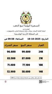 المرفأ…أعلنت النقابة العامة لأصحاب محلات تجارة وصياغة الحلي والمجوهرات في المملكة الأردنية الهاشمية، صباح اليوم السبت ، التسعيرة اليومية الرسمية لبيع وشراء الذهب في السوق المحلي.