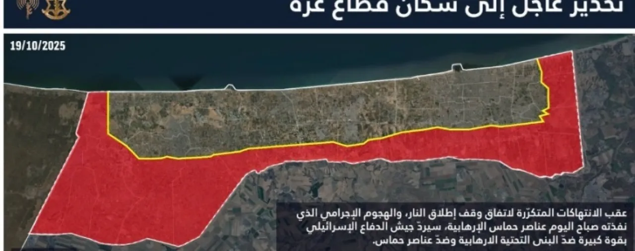المرفأ …نشر المتحدت باسم الجيش الاسرائيلي خريطة تطالب الفلسطينيين بالبقاء في المناطق ماوصفه غرب الخط الاصفر وهو الخط الذي انسحب عنده جنود الاحتلال ضمن خطت ترامب.