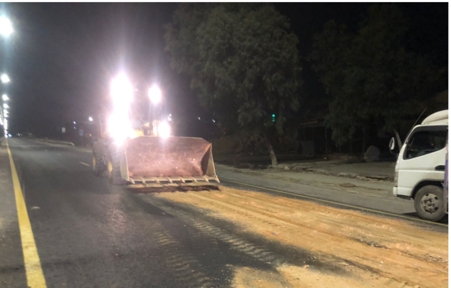 و حضرت كوادر مديرية اشغال محافظة جرش وآلياتهم حيث قامت تغطية الزيت المسكوب بالرمال لتجنب الانزلاقات في حين بقي رجال الأمن العام لتسهيل حركة المرور و المحافظة على سلامة مستخدمي الطريق