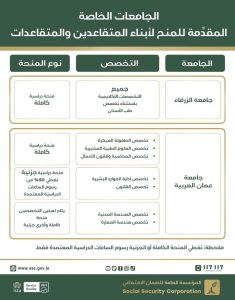 المرفأ- أعلنت المؤسسة العامة للضمان الاجتماعي عن فتح باب التقديم للاستفادة من المنح الدراسية الجامعية لأبناء المتقاعدين والمتقاعدات الأردنيين؛ للحصول على درجة البكالوريوس للعام الدراسي 2025/ 2026 وذلك بالشّراكة مع جامعتي الزّرقاء وعمّان العربية.