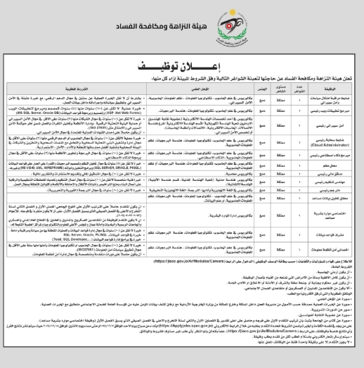 هيئة النزاهة ومكافحة الفساد تعلن عن وظائف شاغرة