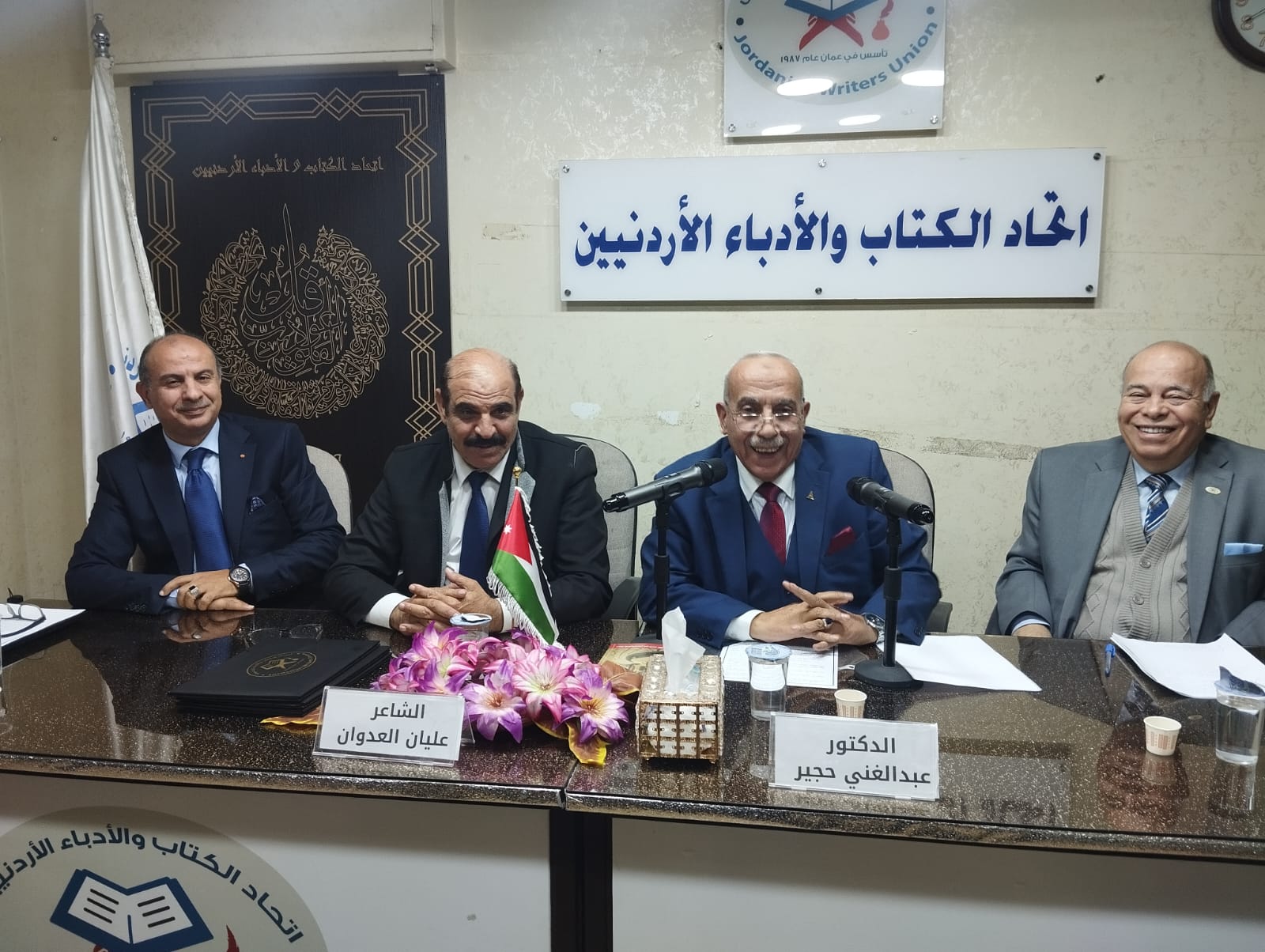 الأستاذ الدكتور محمد عيسى العدوان، والأستاذ الدكتور عبدالغني حجير، والأستاذ الدكتور مهدي العلمي، فيما تولّى إدارة الندوة الشاعر عليان العدوان، رئيس اتحاد الكتّاب والأدباء الأردنيين.