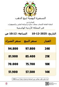 وبحسب النشرة اليومية الصادرة عن النقابة العامة لأصحاب محال تجارة وصياغة الحلي والمجوهرات، بلغ سعر الغرام الواحد من الذهب عيارات 24 و18 و14 لغايات البيع في محال الصاغة 97.8 و75.7 و57.5 ديناراً على التوالي.