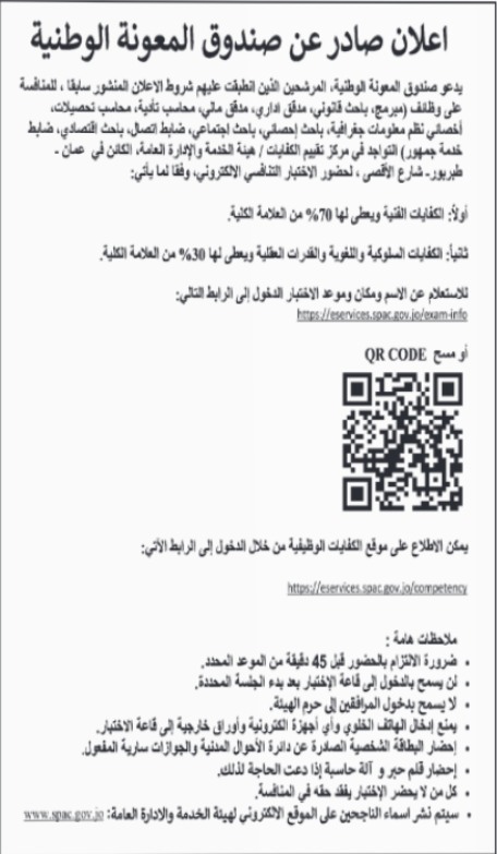 صندوق المعونة الوطنية يدعو مرشحين للامتحان التنافسي..أسماء On ديسمبر 18, 2025 Share 3٬306 المرفأ- اعلن صندوق المعونة الوطنية، اليوم الخميس، المرشحين الذين انطبقت عليهم شروط الاعلان المنشور سابقا للامتحان التنافسي. Share 3٬306