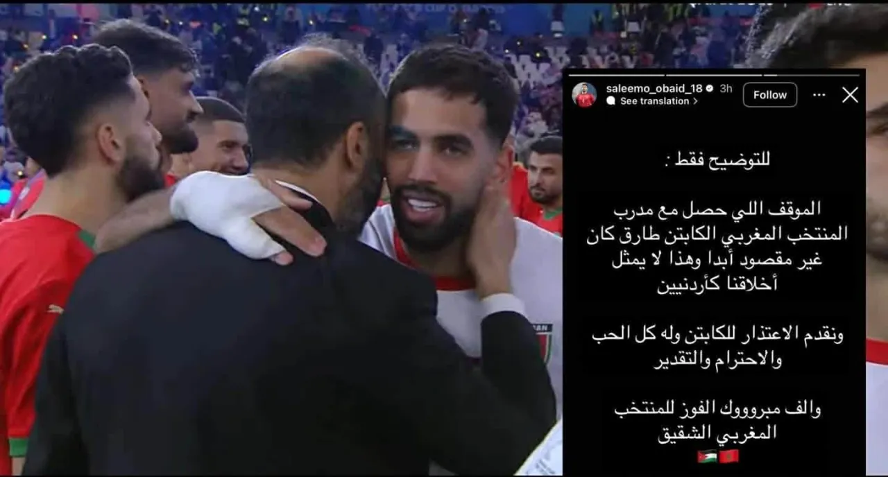 المرفأ- اعتذر اللاعب الأردني سليم عبيد بعد موقف عدم مصافحة لاعبي المنتخب الوطني لمدرب المنتخب المغربي طارق السكتيوي، الذي أثار الجدل على مواقع التواصل الاجتماعي.