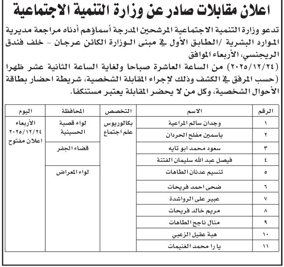 وزارة التنمية الاجتماعية تدعو مرشحين لاجراء المقابلة الشخصية..أسماء On ديسمبر 21, 2025 Share 4٬160 المرفأ- دعت وزارة التنمية الاجتماعية اليوم الأحد، التالية أسماؤهم لاجراء المقابلة الشخصية. Share 4٬160