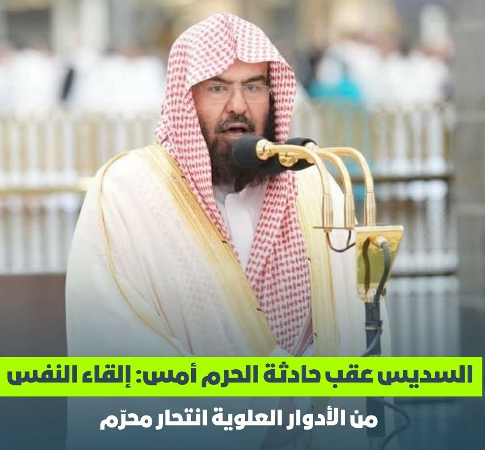 وحذّر السديس، عقب الحادثة، مما يقدم عليه بعض الأشخاص – وهم قلة – من محاولات إلقاء أنفسهم من الأدوار العلوية، مؤكدًا أن ذلك يُعد نوعًا من الانتحار المحرَّم شرعًا، مستشهدًا بقول الله تعالى: ﴿وَلَا تَقْتُلُوا أَنْفُسَكُمْ﴾، وبقول النبي ﷺ: «مَن قتلَ نفسَهُ فهو في نارِ جهنَّم»، مبينًا أن من مقاصد الشريعة الإسلامية حفظ النفس وعدم تعريضها للتهلكة، قال تعالى: ﴿وَلَا تُلْقُوا بِأَيْدِيكُمْ إِلَى التَّهْلُكَةِ﴾.