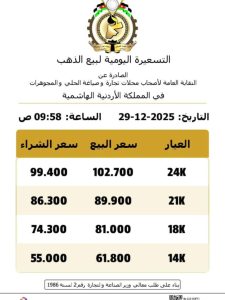 الأردن انخفاض أسعار الذهب في السوق المحلي بمقدار دينار كامل للغرام