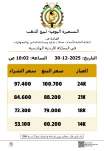 كما بلغ سعر الغرام الواحد من الذهب عيارات 24 و18 و 14 لغايات البيع من محلات الصاغة عند 100.70 و 79 و 60.20 دينار على التوالي.