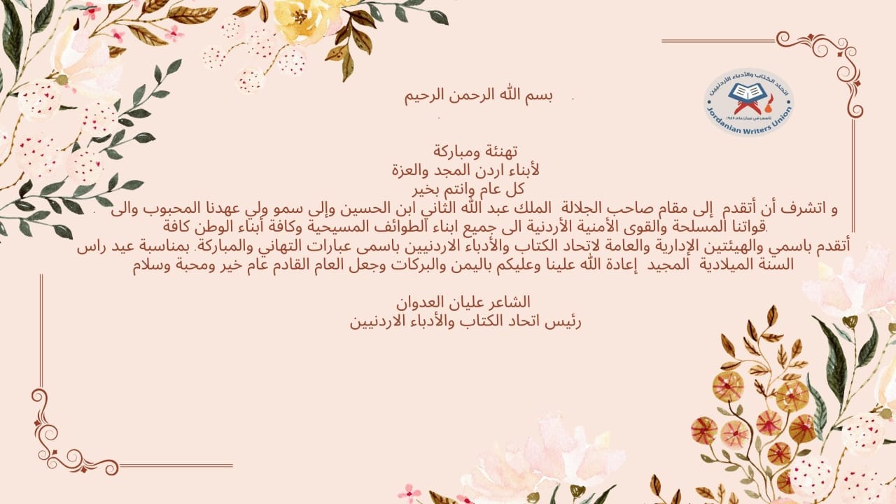 أتقدم باسمي والهيئتين الإدارية والعامة لاتحاد الكتاب والأدباء الاردنيين باسمى عبارات التهاني والمباركة. بمناسبة عيد راس السنة الميلادية المجيد إعادة الله علينا وعليكم باليمن والبركات وجعل العام القادم عام خير ومحبة وسلام