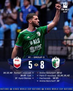 وفي المجموعة الثالثة، استهل المنتخب الجزائري مشواره بفوز قوي على منتخب بولندا بنتيجة (8–5)، في مباراة شهدت مشاركة أسماء كروية عالمية للمرة الأولى في كأس الملوك، حيث قاد النجم البولندي روبرت ليفاندوفسكي منتخب بلاده، فيما مثل الجزائر المدافع الدولي السابق كارل مجاني. وجاءت المواجهة على قدر التوقعات، غير أن الأفضلية كانت جزائرية بفضل الأداء الهجومي اللافت.