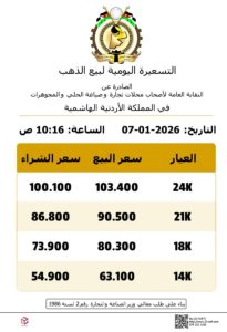 وبلغ سعر بيع غرام الذهب عيار 21، في السوق المحلية، إلى 90.5 دينار لغايات البيع من محالّ الصاغة، مقابل 86.80 دينار لجهة الشراء،