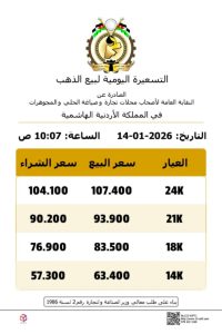 وبلغ سعر الغرام الواحد من الذهب عيارات 24 و18 و14 لغايات البيع من محلات الصاغة عند 107.4 83.5 63.0 دينار على التوالي.
