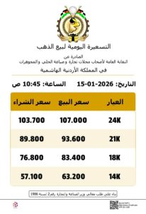 المرفأ- بلغ سعر بيع غرام الذهب عيار 21 في السوق المحلية الخميس93.60 دينارا لغايات البيع من محالّ الصاغة، مقابل 89.80 دينارا لجهة الشراء، وفقا للنقابة العامة لأصحاب محالّ تجارة وصياغة الحلي والمجوهرات.