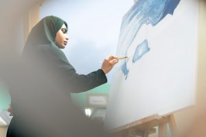 داخل معرض الصور التراثي، اصطفّت اللوحات البيضاء بانتظار أفكار تولد من المكان، فيما انتشرت أدوات الرسم على الطاولات، أنابيب ألوان مفتوحة، درجات الأزرق والرمادي والأخضر الترابي، وبقع لونية تسبق اكتمال العمل. الفرش بأحجامها المختلفة تحرّكت بهدوء، تارةً بضربات واسعة وواثقة، وتارةً بلمسات دقيقة، وكأن كل حركة تستجيب لإيقاع المكان.